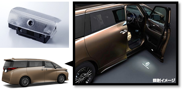 カーテシロゴランプはドア内側下部に装着される灯具です。自動車のドアが開いているときにランプが点灯し後続車への追突防止の注意を促すこと(カーテシランプ機能)に加え、夜間等に乗降者の足元を明るく照らしながらロゴ等の地面への投影により、乗員の迎え入れをより豪華に演出することができます(ロゴランプ機能)。