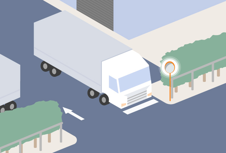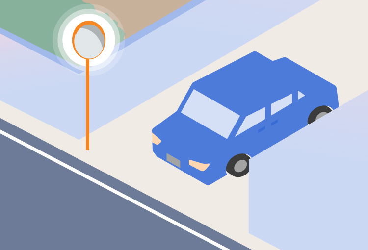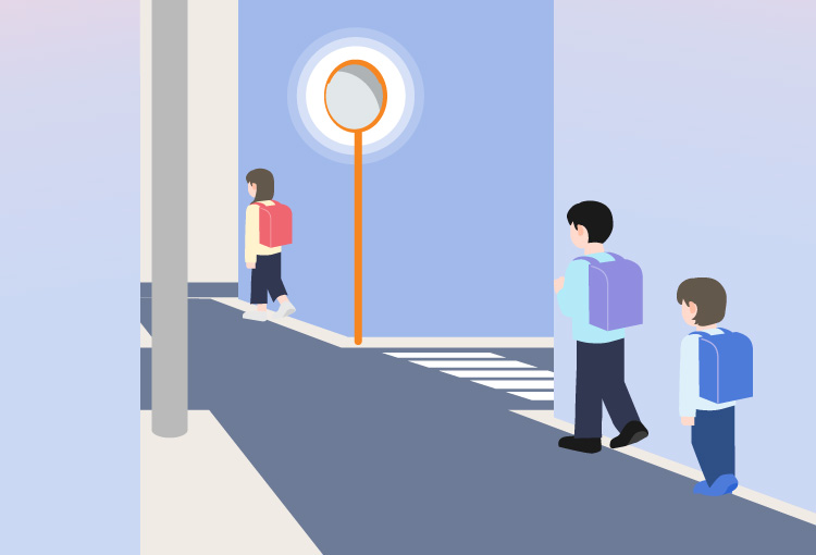 センサーが歩行者や車両を検知すると、カーブミラー外周のLEDテープライトが自動で点滅。見通しの悪い交差点、通学路、工場出入口などに最適です。